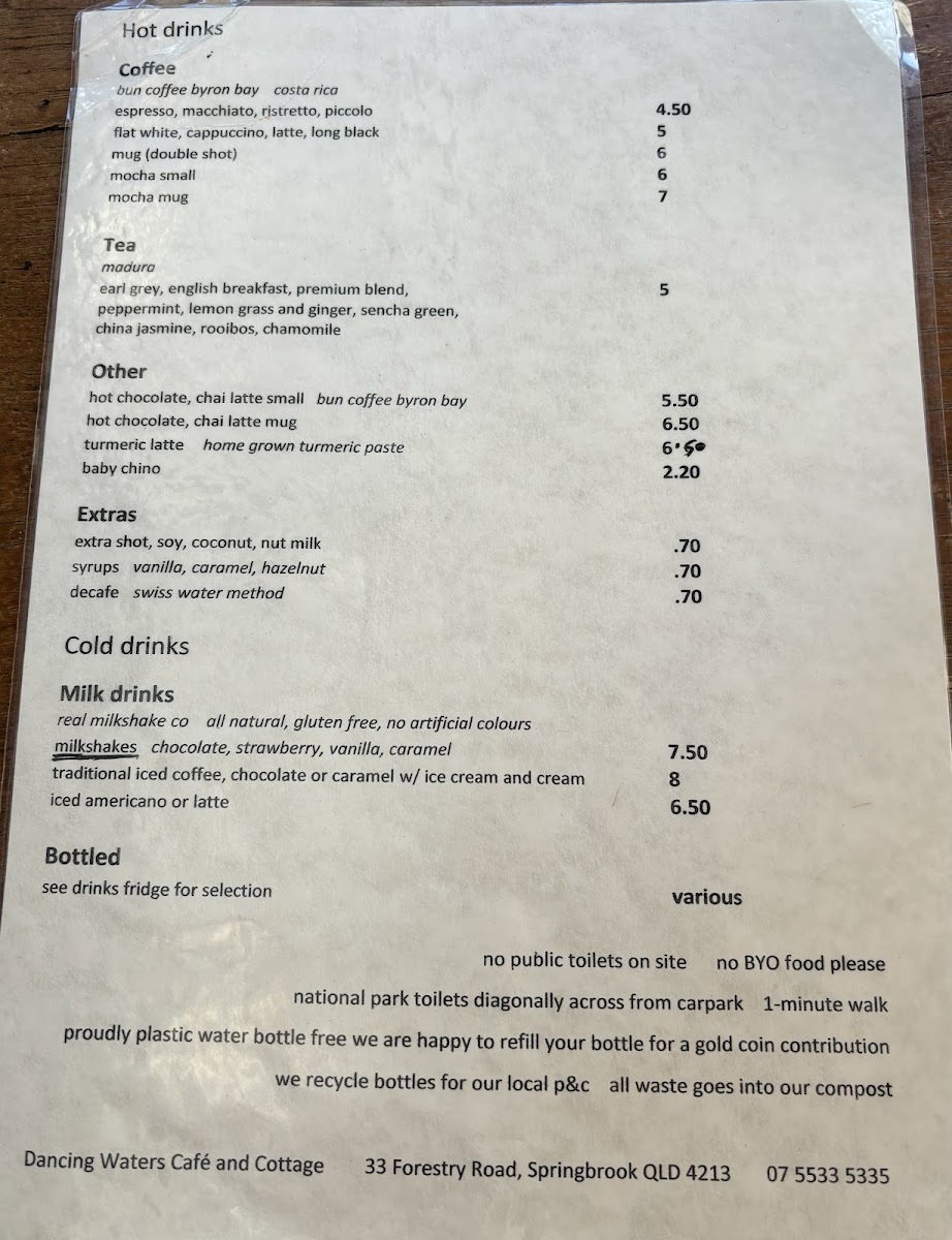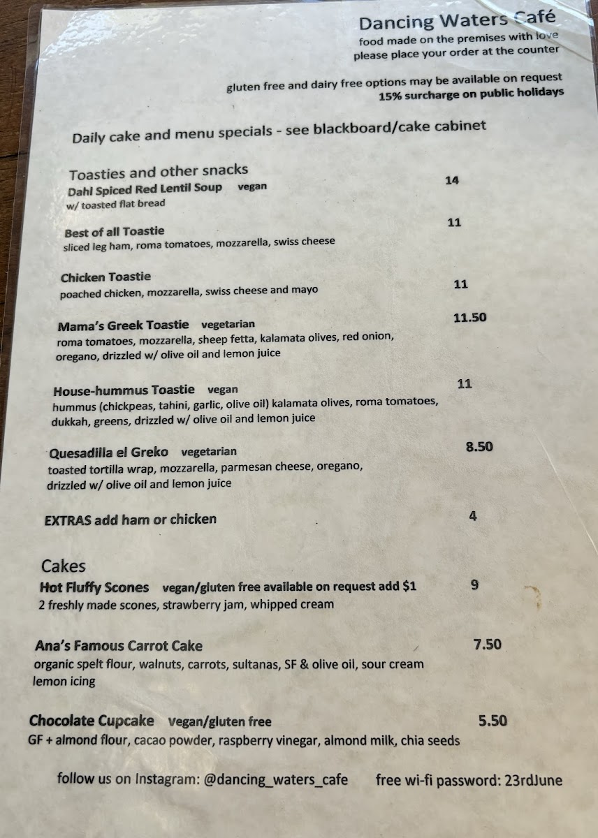 The menu at Dancing Waters Café is a delightful blend of comforting and wholesome dishes, specially crafted to cater to a variety of tastes and dietary preferences. One standout offering is the Dahl Spiced Red Lentil Soup, a warm, velvety hug of spices and lentils, paired beautifully with toasted flatbread—a dish that warms both body and soul after a day on the trails. Another must-try is the Mama’s Greek Toastie, a vegetarian option that bursts with flavors of roasted roma tomatoes, sheep fetta, kalamata olives, and a drizzle of luscious olive oil and lemon juice, perfectly grilled to oozing perfection.